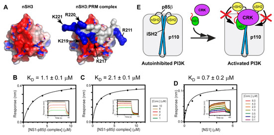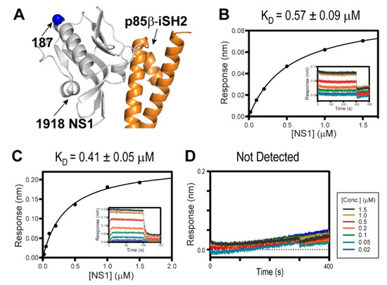 To study the interaction of 1918 NS1 with PI3K and CRK, we employed full-length CRK proteins (CRK-II and CRK-L), the iSH2 domain of p85β subunit of PI3K (p85βiSH2), and 1918 NS1 containing ED and CTT (1918 NS1ED-CTT) (Figure 1). Previous studies indicated that the interaction with PI3K is mediated by monomeric form of NS1ED [11,13,27]. The isolated NS1ED forms a W187-mediated homodimer [36,37,38]. Although the homodimerization is weak (KD ~ 89 µM) [37], it can interfere with the quantitative measurement of the characteristics of the binding between NS1 and host proteins. Thus, we incorporated an W187R substitution, which was shown to prevent homodimerization and precipitation of NS1ED-CTT [37]. It should be noted that W187 is located on the opposite side of the p85β-binding site (Figure 2A). Moreover, it was shown that W187R substitution in 1918 NS1 did not affect binding to p85βiSH2 [27].