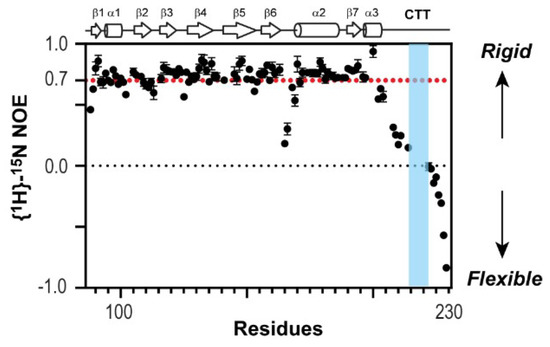 To test directly whether the CTT is structurally flexible in the context of 1918 NS1ED-CTT, we used NMR 1H-15N heteronuclear Overhauser effect (het-NOE) [40], which is extremely sensitive to the motion of the protein backbone. Briefly, a het-NOE value below 0.7 indicates that the residue is structurally dynamic, while values ranging from 0.7 to 1.0 indicate that the conformation of the residue is rigid. We found that het-NOE values across the CTT were significantly lower than 0.7, indicating its high conformational flexibility in the protein (Figure 3). Moreover, the resonances of 10 residues belonging to the PRM (residues 212–221, except residue 214) were missing in the 1H-15N HSQC (heteronuclear single quantum coherence) spectrum owing to a line-broadening effect (blue region in Figure 3), indicating that the region undergoes conformational exchange in an intermediate NMR timescale, typically in microsecond to millisecond timescales [41,42]. Taken together, these results provide direct evidence of the highly dynamic conformation of the CTT including the PRM.