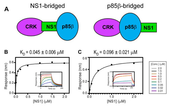 Ylösmäki et al. showed that avian NS1, with the PRM sequence similar to 1918 NS1, forms a ternary complex with PI3K and CRK [29]. They also proposed two alternative modes of the ternary complex: NS1-bridged and p85β-bridged modes (Figure 4A). The critical distinction between the two binding modes is based on whether CRK binds to the CTT (i.e., PRM) of NS1 or to p85β.