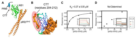 Interestingly, we noticed that the affinity of CRK to the 1918 NS1:p85βiSH2 complex is approximately 10-fold higher than to free 1918 NS1 (Figure 2B and Figure 4B), suggesting the interaction between CRK and p85βiSH2. The direct CRK:p85βiSH2 interaction was not reported. Although it was shown that CRK binds to the PRM of p85β [43,44,45], the region is not present in p85βiSH2. Thus, we further tested the direct binary interaction between CRK-II and p85βiSH2 in the absence of 1918 NS1. Indeed, we found that CRK can interact with p85βiSH2 in the absence of 1918 NS1, although the interaction was too weak to be measured quantitatively (Figure 5D). To our knowledge, this is the first observation of the direct interaction between CRK and p85βiSH2. These data suggest that the ternary complex is stabilized by at least three disparate intermolecular interactions: 1918 NS1 CTT-CRK, 1918 NS1ED-p85βiSH2, and CRK-p85βiSH2 interactions. Considering the weak affinity, we expect that the direct CRK:p85βiSH2 interaction might be effective only via 1918 NS1. This also indicates that 1918 NS1 binds more tightly to p85β in the presence of CRK. Moreover, our structural and BLI data indicate that 1918 NS1 is able to form the ternary complex in any order, that is, 1918 NS1 binds to either CRK or PI3K and then to the rest.