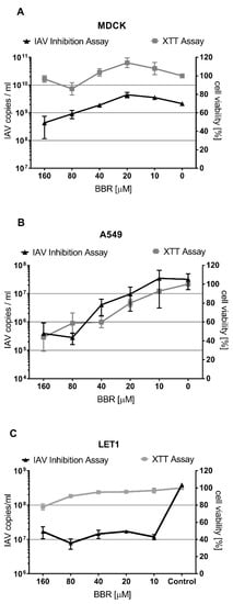 BBR-mediated inhibition of influenza A virus is cell-type dependent. RT-qPCR analysis (black, left Y-axis) of cell culture supernatants infected with influenza A virus (IAV); tissue culture infectious dose (TCID50) = 400/mL) with or without BBR. Control samples were treated in the same manner with the same volume of DMSO. XTT assay results (right Y-axis) are indicated in gray (A–C). The results are presented as average values with standard deviations (error bars). All experiments were performed at least in triplicate.