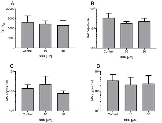 Some reports on the anti-influenza properties of BBR are conflicting. For MDCK cells, Cecil et al. showed that BBR did not affect virus replication, while Wu et al. reported substantial inhibition in this culture model [,]. In our study, we observed noticeable influenza A virus inhibitory properties at high concentrations, similar to those obtained by Wu et al. []. The main difference between the studies was the concentration range used, as the effective concentration in the MDCK cells is unusually high.