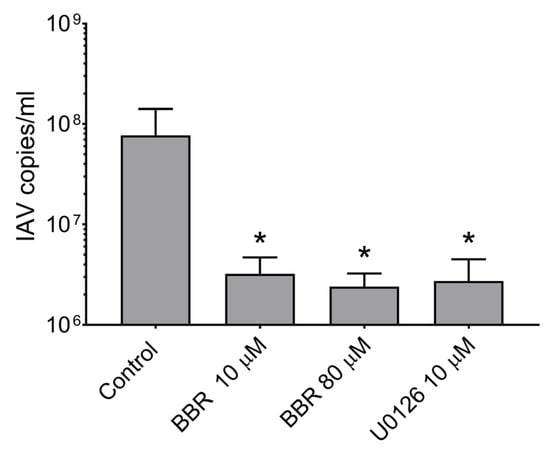 BBR inhibits influenza A replication at the late stages of infection. LET1 cells were infected with influenza A virus (IAV); TCID50 = 1000/mL). After 2 h p.i., 10 µM U0126 in DMSO or BBR were added. Control samples were treated in the same manner with the same volume of DMSO. All experiments were performed in triplicate. The results are presented as average values with standard deviations (error bars). An asterisk (p < 0.05) indicates values that are significantly different from the control.