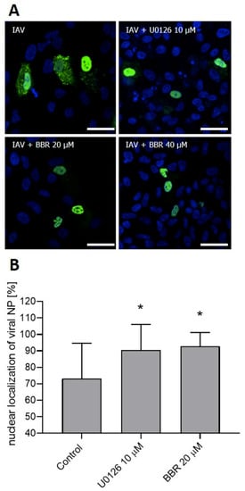 BBR blocks the transport of influenza A ribonucleoprotein to the cytoplasm. A549 cells were infected with influenza A virus (IAV); TCID50 = 2000/mL) in the presence of 10 µM U0126 in DMSO (U0126), 20 µM BBR (BBR 20 µM), or 40 µM BBR (BBR 40 µM). Cells were fixed 12 h after the infection, and confocal images were collected (A). Cell nuclei are denoted in blue, influenza A NP protein is denoted in green. Scale bar = 50 µm. Confocal microscopy analysis of the nuclear localization of influenza A virus nucleoprotein (B). The statistical significance of the phenomena was assessed by image analysis, where retention of influenza A virus nucleoprotein in nuclei was scored as described in the Materials and Methods section. The data are presented as mean value ± SD from at least four hundred cells collected from at least three independent experiments. An asterisk (p < 0.05) indicates values that are significantly different from the control.