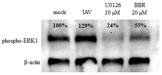 BBR inhibits virus-induced mitogen-activated protein kinase/extracellular signal-related kinase (MAPK/ERK) pathway. A549 cells were infected with influenza A virus (IAV); TCID50 = 2000/mL) or with mock with the addition of DMSO solvent, U0126 (10 µM), or BBR (20 µM). Cells were lysed 12 h after infection and resolved by 12% SDS-PAGE. Phosphorylated ERK-1 protein was visualized by Western blot with an anti-phosphorylated ERK-1 antibody. β-actin was visualized as a reference control. Percentage values show the relative expression ratio of phospho-ERK1 after normalization to β-actin signal in each lane.