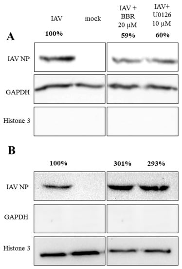 BBR treatment leads to the accumulation of influenza A virus NP in nuclei. The figure shows Western blot analyses of cytoplasmic (A) and nuclear (B) fractions of A549 cells infected with influenza A virus (TCID50 = 2000/mL) with the addition of DMSO solvent, U0126, or BBR at given concentrations. After 12 h, cytoplasmic and nuclear fractions of the cells were obtained and resolved by 12% SDS-PAGE. Influenza A nucleoprotein (IAV NP) was visualized by Western blot with anti-NP. GAPDH (glyceraldehyde 3-phosphate dehydrogenase) and histone 3 proteins were blotted as fraction purity markers. Percentage values show relative expression ratio of influenza A virus NP after normalization to GAPDH (A) or histone 3 (B) signal in each lane.