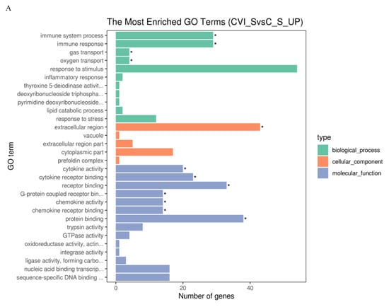 KEGG distinctly segregates the DEGs on the basis of functionality, whereas GO hierarchically distributes the cohort of genes into three distinct classes of cellular, molecular, and biological terms, respectively. To determine the functionality associated with DEGs, analysis of GO terms and KEGG pathways was conducted. The results showed that there were more up-regulated DEGs associated with the immune response to CVI988 than to vvRB1B in light of uninfected lymphocytes, which significantly enriched biological molecules related to the immune system process, immune response, gas transport, and oxygen transport (Figure 3A,B). The notable molecular functions of the DEGs in the CVI988 group consisted of cytokine activity, cytokine receptor binding, receptor binding, G-protein coupled receptor binding, chemokine activity, and chemokine receptor binding (Figure 3A). However, the remarkable molecular functions for the DEGs in the vvRB1B group included cytokine activity, receptor binding, protein binding, and trypsin activity (Figure 3B), and the genes for cytokine activity of molecular function in the vvRB1B group were not significantly different from those in the CVI988 group (Figure 3A,B). The results also indicated that CVI988 stimulated more interaction of cytokines with cytokine receptors and chemokines with chemokine receptors compared to vvRB1B, but no down-regulated DEGs were significantly enriched in processes of the immune response to CVI988 and vvRB1B infection (Figure 3C,D).