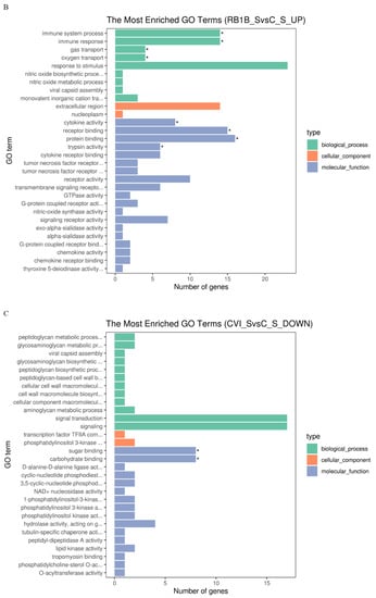 Gene Ontology (GO) terms and KEGG pathway enrichment of the DEGs. The most enriched GO terms for up-regulated DEGs in CVI988 versus control (A) and vvRB1B versus control (B), down-regulated DEGs in CVI988 versus control (C), and vvRB1B versus control (D). The most enriched KEGG pathway for up-regulated DEGs in CVI988 versus control (E) and vvRB1B versus control (F). (* indicates significant enrichment of GO term; q value (range 0–1) is the p value that was corrected by multiple hypothesis tests. The closer the q value is to zero, the more significant the enrichment of the KEGG pathway).
