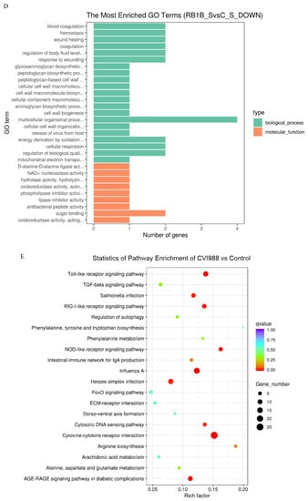 Alteration of biological pathways is coincident with expression patterns of the signal molecules during the host response to infection, so the DEGs were further analyzed based on the gene ontology (GO) and Kyoto Encyclopedia of Genes and Genomes (KEGG) pathways [42]. The KEGG analysis showed that, compared with vvRB1B, the NOD-like and RIG-I-like receptor signaling were among the differential pathways related to CVI988, and it also showed that CVI988 could initiate the innate immune response, and then induce an adaptive immune response (Figure 3E,F).