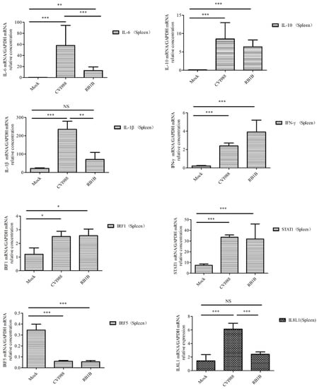 Analysis of DEG expression of splenic lymphocytes in CVI988, vvRB1B, and mock groups. The relative quantity of IL-6, IL-1β, IL-10, IFN-γ, STAT1, IRF1, IL8L1, GGCL1(CCL4), CCL5, CCL19, and CCL26 (CCLI10) gene expression of splenic lymphocytes in CVI988, vvRB1B, and control groups. “NS” indicates no significant difference (p > 0.05). “*”, “**” and “***” indicate statistically significant differences with values of p < 0.05, p < 0.01, and p < 0.001, respectively.