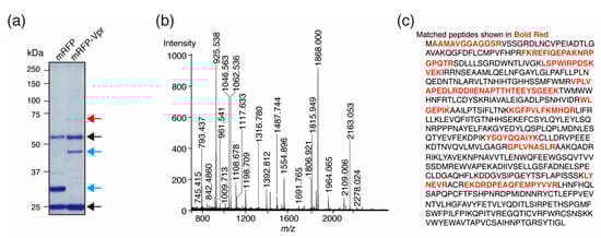 Monocytes from healthy donors were differentiated into MDMs, as described previously [,]. MDMs were suspended in binding buffer (10 mM Tris-HCl (pH 7.8), 1 mM ethylenediaminetetraacetic acid) and lysed with four freeze-thaw cycles. The MDM lysates were incubated with purified mRFP-Vpr conjugated to agarose beads at 4 °C for 4 h and then washed with binding buffer. Protein complexes were eluted by heat denaturing and then solubilized in Laemmli sample buffer. The proteins were analyzed by electrophoresis on 10% sodium dodecyl sulfate (SDS) polyacrylamide gels and visualized by Coomassie brilliant blue (CBB) staining. The CBB-stained bands were excised, digested with trypsin, and analyzed using an Ultraflex matrix-assisted laser desorption ionization time-of-flight (MALDI-TOF) mass spectrometer (Bruker Daltonics, Bremen, Germany). Peptide mass fingerprinting was performed by screening each peak list against the NCBI nr database using the MASCOT program (Matrix Science, London, UK).