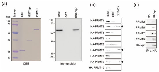 Next, we investigated Vpr binding by other PRMT family members, which share common PRMT motifs []. We performed GST pull-down assays using purified recombinant HA-tagged PRMTs and found that PRMT2, PRMT7, and PRMT9 could bind directly to GST-Vpr (Figure 2b).