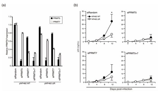 Vpr functions to promote virus production in cells of the monocyte-macrophage lineage [,,]. We hypothesized that, because the expression level of PRMT5 and PRMT7 affected Vpr levels, HIV-1 production would also be affected by these proteins in macrophages. To test this hypothesis, we examined virus production following knockdown of PRMT5 and PRMT7 in human MDMs from Donor 2. Briefly, siPRMT5- and/or siPRMT7-transfected MDMs were infected with NF462 WT or NF462 ΔR strain and cultured for 12 days. Virus production was measured using p24 ELISA at 4, 8, and 12 days post-infection. To confirm the expression levels of PRMT5 and PRMT7, we performed immunoblotting. Unfortunately, these proteins could not reliably be detected because of the small sample volumes obtained from the HIV-1-infected MDMs. Therefore, we measured PRMT5 and PRMT7 expression levels by qPCR as described by Demetriadou et al []. The results showed that knockdown was still maintained at 12 days post-infection (Figure 4a). The NF462 WT strain showed significantly higher virus titer than the NF462 ΔR strain in cells transfected with siRandom at 12 days post-infection, when the expression levels of PRMT5 and PRMT7 were similar (Figure 4a, lanes 1 and 5). As hypothesized, the production of NF462 WT virus was inhibited by knockdown of PRMT5 and/or PRMT7. There were no significant differences in virus production between the NF462 WT and NF462 ΔR strains in the context of PRMT5 and/or PRMT7 knockdown at 12 days post-infection (Figure 4b). These results showed that low expression of PRMT5 and PRMT7 reduced the productivity of the NF462 WT strains to equal that of the NF462 ΔR strain, suggesting that PRMT5 and PRMT7 may promote efficient virus production in macrophages by stabilizing Vpr.