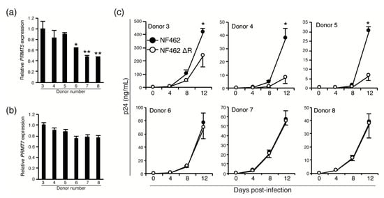 Next, we examined whether low expression levels of PRMT5 and PRMT7 resulted in the same virus productivity in wild-type and Vpr-deficient strains in cells of the monocyte-macrophage lineage. As the expression of PRMT family proteins in macrophages had not been previously described, we first analyzed the expression of PRMT5 and PRMT7 in MDMs isolated from six individual donors (Donors 3–8) using qPCR. We discovered PRMT5 expression differed among donors (Figure 5a); PRMT5 mRNA expression was significantly lower in Donors 6, 7, and 8 than in Donors 3, 4, and 5 which had similar levels of expression. The mRNA expression level of PRMT7 did not differ significantly among the six donors (Figure 5b).