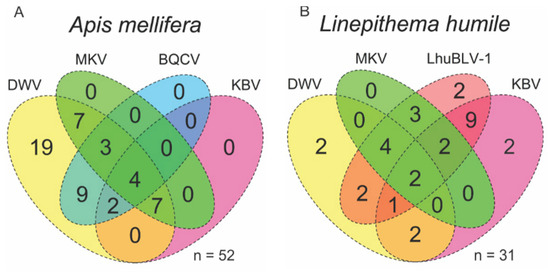 Venn diagram of virus coinfection in honey bees (Apis mellifera) (A) and Argentine ants (Linepithema humile) (B). Most prevalent viruses were DWV in honey bees and LhuBLV1 in Argentine ants. BQCV: black queen cell virus; DWV: deformed wing virus; KBV: Kashmir bee virus; LhuBLV1: Linepithema humile bunya-like virus 1; MKV: Moku virus.