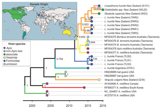 In this study, we tested the hypothesis that a range of pollinators and associated arthropods, including honey bees and Argentine ants, are infected by the same viral pathogens. Furthermore, we hypothesised that frequent inter-species viral transmission results in viral phylogenies that are predominantly associated with geographic origin instead of being associated with host species. Firstly, we screened pollinators and associated arthropods for five RNA viruses and tested for virus replication. Most bee-affecting viruses are positive sense single-stranded RNA (+ssRNA) viruses [34,35], including deformed wing virus (DWV), Kashmir bee virus (KBV), black queen cell virus (BQCV), and Moku virus (MKV). However, we also tested for a negative sense ssRNA (-ssRNA) virus that was recently discovered in Argentine ants, the Linepithema humile bunya-like virus 1 (LhuBLV1). Limited knowledge about the host range of these viruses, particularly hosts of ‘bee viruses’ outside bees, makes identifying hosts and potential reservoirs an important step in understanding virus emergence. Secondly, we quantified to what degree the host species and geographic origin of DWV and KBV strains correlate with shared ancestry. We used phylogenetic analysis and phylogeny–trait correlation of our sequences supplemented with viral sequences retrieved from GenBank from various hosts all over the world. Phylogenies separated by geographic regions with hosts interspersed within these can provide evidence for inter-specific transmission. Alternatively, clustering within hosts species could indicate a high degree of host specificity.