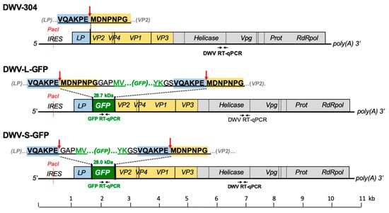 The full-length infectious cDNA clone of DWV type A, pDWV-304 (GenBank accession number MG831200) [11] was used to design eGFP-expressing constructs, pDWV-L-GFP and pDWV-S-GFP (Figure 1; Text S1). Cloning included the generation of sections of DWV cDNA with egfp insertions at the leader protein-viral protein 2 (LP-VP2) border by overlap extension polymerase chain reaction (PCR) and subcloning, using pDWV-304 [11] and pAcP(+)IE1-eGFP [13] as the templates for DWV and egfp amplification, respectively; the primers are listed in Table S1. The cloning procedure is described in detail in Text S1.