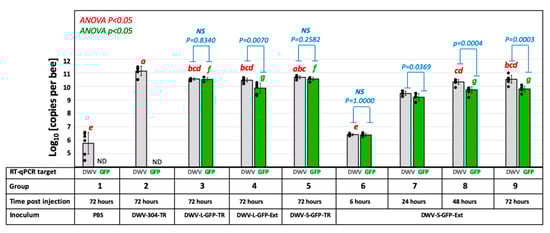 Quantification of the eGFP and DWV RNA targets in pupae injected with extracts containing 107 GE of recovered DWV-L-GFP or DWV-S-GFP showed that at 72 dpi DWV copy numbers were significantly higher (P < 0.05, ANOVA) than those of GFP indicating accumulation of DWV variants without egfp insert. Both egfp-tagged DWV variants showed similar levels of GFP and DWV at 72 hpi (Figure 2, Groups 4 and 9, GFP: P = 0. 0.715393, dF = 12; DWV: P = 0.663399, dF = 11, ANOVA), and similar difference between DWV and GFP copy numbers in individual pupae (Figure S3, Groups 4 and 9, P = 0.1578, dF = 12, ANOVA). In the case of DWV-S-GFP injection, pupae were also sampled at 6, 24 and 48 hpi, showing non-significant differences between DWV and GFP copy numbers within each time group at 6 and 24 hpi, while at 48 dpi the copy number of DWV RNA significantly exceeded that of the GFP RNA (Figure 2, Groups 6, 7, 8). Such differences suggest that in addition to the egfp-tagged DWV, injected pupae contained DWV without these inserts.