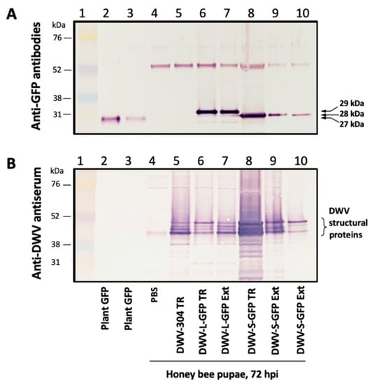 The Western blot analysis with anti-GFP antibodies clearly showed the accumulation of the 29 kDa GFP protein in pupae injected with the DWV-L-GFP transcript, indicating accumulation of fully processed free eGFP. Surprisingly, in the case of DWV-S-GFP transcript accumulation of the 28 kDa GFP rather than LP-GFP fusion was observed (Figure 3A, lane 8), indicating that proteolytic cleavage of the shorter version of the LP-GFP linking peptide also took place. The LP-GFP linking peptide, in the case of DWV-S-GFP, possibly led to the cleavage between glutamate and glycine residues of the peptide VQAKPEGAP, the glutamate-glycine cleavage site that was demonstrated for the DWV peptide linking VP1 and VP3 [10,17]. The observed differences of the molecular weight of DWV vectors compared to free monomeric GFP in the plant tissue controls (28 kDa for DWV-S-GFP, 29 kDa for DWV-L-GFP, and 27 kDa for plant-expressed free GFP) was probably the result of the residual peptides left after the proteolytic cleavage of the eGFP from the viral polyprotein and was in good agreement with their molecular weight predictions of 27.97 kDa, 28.69 kDa and 26.93 kDa, respectively (Figure S1). Importantly, the Western blot analysis with anti-GFP antibodies showed the absence of detectable quantities of polypeptides heavier than the expected monomeric eGFP, which could be the result of the accumulation of the eGFP fusions with LP and structural VP2 proteins (Figure 3A). The visible band with molecular weight about 55 kDa was present not only in the case of DWV-L-GFP and DWV-S-GFP, but also in the case of the PBS-injected pupae with low DWV levels and the DWV-304 injected with high DWV levels (Figure 3A,B). This indicated complete proteolytic processing of the GFP-VP2 peptide in the case of both DWV-L-GFP and DWV-S-GFP (Figure 3A) suggesting that maturation of the structural proteins capable of packaging DWV genomic RNA took place during the replication of the egfp-tagged DWV.