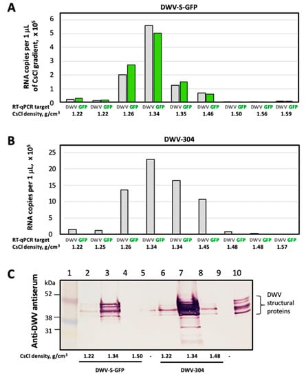 We found that in the case of DWV-S-GFP, the 1.34 g/cm3 buoyant density fraction showed the highest levels of both GFP and DWV targets (Figure 4A). In the case of DWV-304, the highest level of DWV RNA genome was also in the same 1.34 g/cm3 CsCl gradient fraction (Figure 4B), which was within the range of the predicted buoyant density for viruses of the family Iflaviridae in CsCl (1.29–1.38 g/cm3) [21]. In addition, Western blot analysis with the antisera against DWV virus particles confirmed the highest load of the DWV capsid proteins in the fractions with the highest levels of DWV for both DWV-304 and DWV-S-GFP (Figure 4C). These results showed that the DWV RNA genome with a 750 nt insertion (717 nt egfp gene and the sequences coding for duplicated flanking peptides) was encapsidated into particles with a stability and buoyant density similar to those of unmodified DWV.