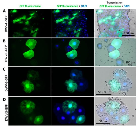 Fluorescence microscopy was used to assess eGFP expression in honey bee pupae injected with the DWV-L-GFP and DWV-S-GFP filtered extracts at 72 dpi. Individual hemolymph cells and tissue fragments, possibly fragments of the immature intestinal epithelium, of the pupae injected with DWV-L-GFP (Figure 5A,B) and DWV-S-GFP (Figure 5C,D; Figure 6C,D) showed strong GFP fluorescence, which was not observed in the case of buffer (PBS) and the unmodified DWV (DWV-304) injections (Figure 6A,B).