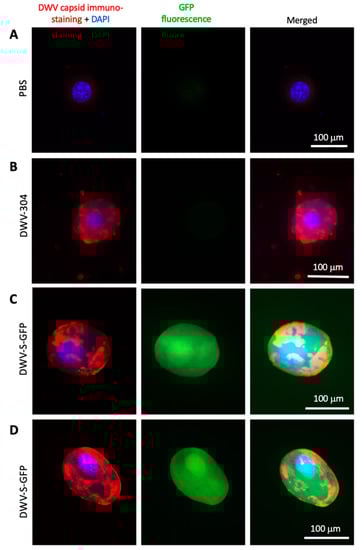 2.4. Detection of GFP and DWV Structural Proteins in Honey Bees by Western Blot and Immunofluorescence Microscopy