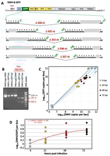 To determine the nature of the deletions in the DWV-S-GFP progeny, we amplified the section that included the egfp insert by RT-PCR using the primers flanking the egfp insert (Table S1) in the pooled DWV-S-GFP extract-injected pupae at 72 hpi and cloned the heterologous fragments with egfp deletions into a plasmid vector. A sample of clones with inserts of different sizes was sequenced and we found different deletions of the 717 nt eGFP-coding sequence ranging from 357 to 438 nt (Figure 7A), Notably, in the case of all deletions, the ORF was restored, which was essential for translation of DWV RNA.