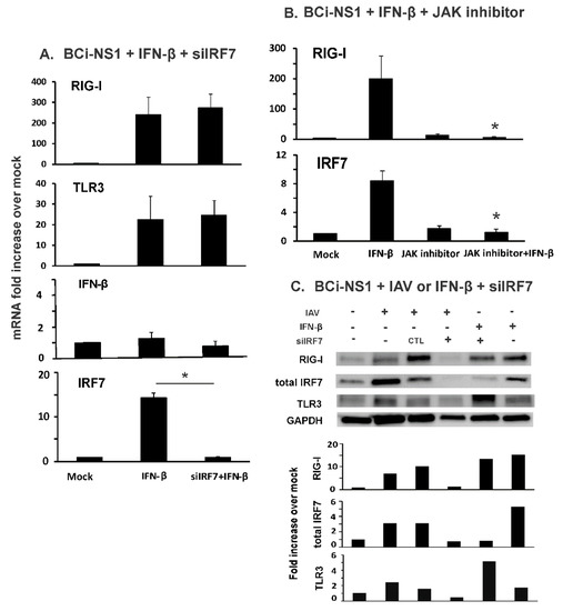3.1. IRF7 Knockdown Inhibited Influenza-Initiated RIG-I and IFN Induction, but not IFN-β-Mediated RIG-I Induction in Human Bronchial BCi-NS1.1 Cells