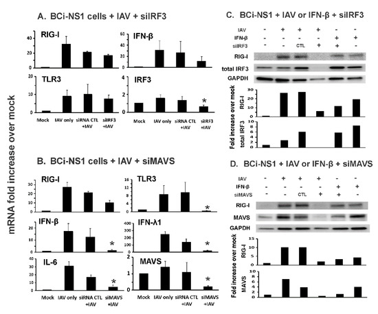 Knockdown of MAVS, but not IRF3, inhibited influenza-mediated RIG-I, TLR3 and cytokine mRNA induction in BCi-NS1.1 cells. The cells were first transfected with (A and C) IRF3 or (B and D) MAVS siRNA and cultured for 72 h and then infected with IAV PR8 (MOI = 0.2) for 24 h. Total RNA was extracted and mRNA expression was assessed by qRT-PCR (A and B). Data were expressed as the means ± SEM from three separate experiments. Statistical significance was determined by ANOVA. * denotes significant difference compared to data from the siRNA CTL+ IAV infected group, p < 0.05. (C and D) RIG-I, IRF3 and MAVS proteins in BCi-NS1.1 cells were detected by immunoblotting. The immunoblot shown is representative of three separate experiments, with quantitation of that result depicted below the image.