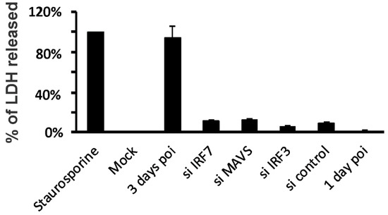 To determine whether the effects seen by siRNA knockdown could be due to non-specific cytotoxicity, we measured LDH release as a percentage of total LDH present (media + cells) during siRNA treatment. Cells were exposed to siIRF7, siMAVS, siIRF3 and siRNA control for 24 h, followed by the measurement of LDH in the media. Staurosporine was used as a positive control for cytotoxicity (Figure 4). Basal LDH release was low (mock). IAV infection caused BCi-NS1.1 cell death after 3 days, but not 1-day post-infection when the samples were collected. LDH levels of all siRNA treated cells and cells at 1-day post-infection were minor compared to the positive control. Thus, the effects in siIRF7- and siMAVS-treated cells is not due to non-specific cytotoxicity.