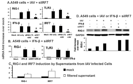 Knockdown of IRF7 inhibited influenza-mediated RIG-I induction and innate responses in human alveolar epithelial cells. A549 cells were transfected with IRF7 siRNA for three days. Then, the cells were infected with (A) IAV PR8 at the MOI of 0.2 for 24 h or (B) 500 U/mL of IFN-β for 6 h. Total RNA was extracted and mRNA expression was assessed by qRT-PCR. Data were expressed as the means ± SEM from three separate experiments. Statistical significance was determined by ANOVA. * denotes significant difference compared to data from the siRNA CTL + IAV infected group, p < 0.05. (C) Supernatants from IAV infected cells stimulated RIG-I/IRF7 expression in uninfected cells. Supernatants were collected from IAV infected cells after 24 h poi. Then the supernatants were filtered to remove IAV using a 100 K MW filter (Amicon). The filtered supernatants were added to A549 cells and changes in RIG-I/IRF7 mRNA were assessed by qRT-PCR. (D) RIG-I protein in A549 cells was detected by immunoblotting. The immunoblot shown is representative of three separate experiments, with quantitation of that result depicted below the image.