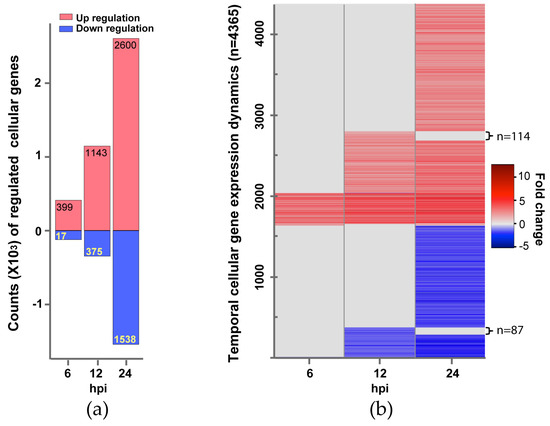 Changes of Influenza B virus (IBV)-regulated cellular genes over time. (a) Counts of genes up-regulated (expression level increase is ≥2 fold) or down-regulated (expression level reduction is ≥½) are shown in red or light blue bars, respectively. Differential expression statistical analysis was conducted using DESeq. (b) Gene expression Dynamics. A total of 4365 genes showing changed expression at one or more time points (6, 12, and 24 hpi). Each gene’s temporal expression dynamics is displayed as a line with a color according to its expression fold change at a time point post IBV infection. A fold change spectrum is shown as the reference.