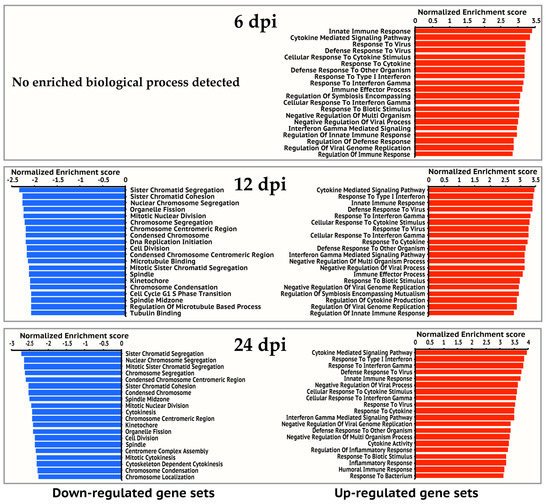 Top 20 enriched gene ontology biological processes for 6, 12, and 24 hpi. Gene ontology enrichment analysis was performed on up-regulated gene set and down-regulated gene set of each time point respectively on the GSEA website. The significantly enriched gene ontology processes were ranked by their enrichment scores and the top 20 processes were shown for each gene set. Blue and red panels represent down-regulated and up-regulated gene sets respectively.