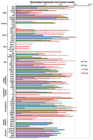 Expression levels of cellular genes in the context of functional category upon IBV infection. The functional categories and included genes with significant expression level changes upon IBV infection are shown below the bar graph. Each bar represents the average reads of 2 repeats for the gene at a time point. The orange, green, blue, and red bars indicate reads of each gene at 0, 6, 12, and 24 hpi, respectively. Differential expression statistical analysis was conducted using DESeq.