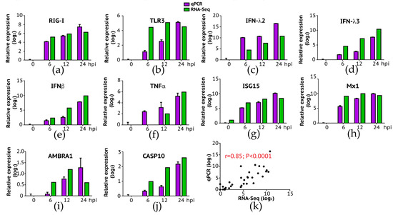 To further validate the gene expression results analyzed by next-generation sequencing, we conducted a conventional RT-qPCR experiment where we measured quantitative changes of a subset of genes in IBV-infected A549 cells as a function of time (post-infection). Selected genes are respectively involved in the innate immune pathway (RIG-I, TLR3, IFN-λ2, IFN-λ3, IFNβ, TNF, ISG15, and Mx1), autophagy (AMBRA1), and apoptosis (CASP10). As summarized in Figure 4, our RT-qPCR experiments confirmed the up-regulation of these genes over time (Figure 4a–j), with a significant correlation between RNA-Seq and RT-PCR results (Figure 4k: Pearson correlation r = 0.85; p < 0.0001). Interestingly, we did not observe expression of TLR7 and TLR8 at all time points in A549 cells probably because both genes are not expressed in this cell line as demonstrated in a previous study [33]. Our data suggest that double-strand RNA sensing pathway including RIG-I and TLR3 is rapidly activated following IBV infection, indicating that this pathway is important in induction of the innate immune response to IBV infection in A549 cells. Future study is needed to address a role of single-strand RNA sensing TLR7 and TLR8 in anti-IBV innate immune response.