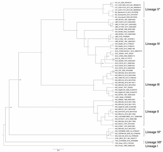 Maximum clade credibility tree of LASV Lineages’ glycoprotein (GP) gene. A phylogenetic analysis of the GP gene of members of confirmed and proposed (*) LASV lineages. The tree is rooted in Lineage I and each node shows the Bayesian posterior probabilities support. The tree tips are labelled to shown country, strain, year of collection, and GenBank accession numbers. Precursor glycoprotein (GPC) nucleotide sequences with greater than 60% coverage for the LASV GPC coding sequence (CDS) were retrieved from the GenBank, a maximum likelihood tree was generated in RAxML v8.2.12 [] on CIPRES []. Bayesian phylogenetic inference was performed using BEAST v1.10.4 [] with Generalized Time Reversible (GTR) plus gamma substitution model, uncorrelated relaxed clock model in lognormal distribution, SkyGrid coalescent tree prior setting, and the maximum likelihood tree as starting tree. Markov chain Monte Carlo (MCMC) chains were run for 250 million iterations, sampled every 10,000 states and 2500 trees were discarded as burn-in, to obtain an effective sample size (ESS) >200 for all parameters. Maximum clade credibility tree was drawn in Tree Annotator v1.10.4 [].