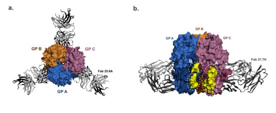 GPC-B† quaternary structure epitope. The 25.6A and 37.7H monoclonal antibodies (mAbs) were raised to the LASV GPC-B conformational epitope. (a). (Top view) The LASV GP trimer is bound by three 25.6A Fabs, with each Fab binding two GP monomers near the trimer’s base. (b). (Front view rotated 60°) The GP trimer bound near its base by three 37.7H Fabs (two Fab in view) in a similar manner as above. Amino acid residues in the 37.7H epitope sites A and B highlighted in yellow to show the antibody footprint. GP monomers are shown as surface representations. LASV GP-mAb bound structures were retrieved from the Protein Database using PDB IDs 6P95 and 5VK2 for 25.6A mAb-bound GP and 37.7H mAb-bound GP respectively, image generated in EzMol 2.1 online program [] and labelled manually.