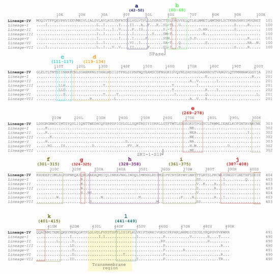 Aligned GP precursor amino acid sequence of LASV confirmed and proposed lineages. Multiple sequence alignment of prototype LASV strains selected from the literature (see Table 1 for detailed description) created with Clustal Omega in Jalview 2.11.0 [] and manually annotated. LASV lineages and strains: Lineage I—Pinneo 1969 Strain, Lineage II—Nig08-04 Strain, Lineage III—Nig08-A19 Strain, Lineage IV—Josiah Strain, proposed lineage V—Soromba-R strain, and proposed lineage VII—Alzey strain), and proposed lineage VI—KAK-428 strain. LASV GP B-cell epitopes include: 37.7H epitope site A (b & j) and site B (e & g), GPC-A (b & e), GP1-A (c), GP2-B (h), GP2-L1(f), GP2-L2 (i), and GP2-L3 (k). LASV GP T-cell epitopes include: GP1 epitope 42–50AA (a), GP1 epitope 60–68AA (b), and GP2 epitope 441–449AA (l).