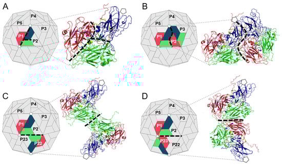 Due to icosahedral symmetry, the protomer subunits and contacts between them are repeated 60 times across the picornavirus capsid. To reduce computing time, single complexes representing the intraprotomer, interprotomer and interpentamer interfaces were generated by extracting the relevant protomer subunits from a homology model of the complete biological assembly of TMEV GDVII [,]. Protomers in the biological assembly are numbered P1–P60 according to their position in the capsid, where P1–P5 constitutes the first pentamer and P6–P10 the second pentamer. Protomers in the derived subcomplexes were labelled according to this scheme. To represent the intraprotomer interface, a single TMEV protomer (P1) was extracted (Figure 2A). To represent the interprotomer interface, two adjacent protomers within a single pentamer were extracted (P1 and P2) (Figure 2B). Finally, to represent the interpentamer interface, two complexes were generated using three protomers. The first complex, shown in Figure 2C, consisted of a protomer (P1) from one pentamer and an opposing protomer from the adjacent pentamer located across the two-fold axis (P22). The second complex comprised the same protomer (P1), but the second protomer was the adjacent protomer (P23) in the adjacent pentamer located next to the three-fold axis of symmetry (Figure 2D).
