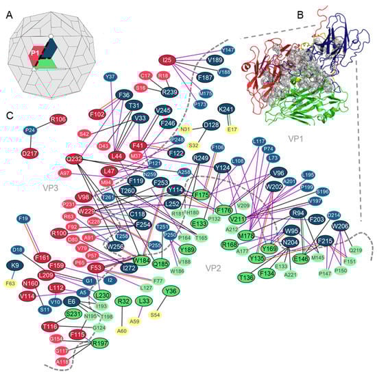 Hotspot residues and their interacting partners at the intraprotomer interfaces of the TMEV capsid. (A) Structure of the picornavirus capsid showing a single protomer. The intraprotomer interfaces between the three main capsid proteins are indicated by dashed black lines. (B) Structural cartoon mapping of predicted hotspot residues (shown as grey spheres) at the intraprotomer interfaces. (C) Schematic network of hotspot residues and the contacts made with their residue binding partners at the intraprotomer interfaces. Hotspot residues are outlined in black. Residues without outlines are non-hotspot partner residues. VP1 residues (blue); VP2 residues (green); VP3 residues (red); VP4 residues (yellow). Noncovalent interactions between hotspots and partners are shown as solid lines: hydrogen bonds (black lines); hydrophobic (purple lines); aromatic (orange lines); aromatic–sulphur (turquoise lines); cation–pi (blue lines); ionic (green lines) interactions.