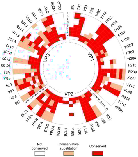 Protein interaction analysis confirmed that all predicted hotspots are involved in at least one interaction across the intraprotomer interface. Most hotspots were found to form contacts with residues across a single protein–protein interface; however, residue Q185 (VP2) was predicted to form hydrophobic interactions with residues T251 (VP1) and M94 (VP3) and contribute to the stability of both protein–protein interfaces. The analysis also revealed that of the 72 hotspot residues, 44 form interactions with other hotspot residues and 39 form multiple contacts. Both hydrogen bonds and hydrophobic interactions were frequent at the VP1–VP3 and VP2–VP3 interfaces, while the contacts between hotspots and their interacting partners at the VP1–VP2 interface were predominantly hydrophobic (Figure 3C).