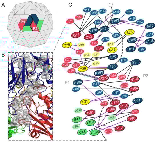 Picornavirus capsids are nonenveloped icosahedral multimers, comprising 60 copies of four capsid proteins (VP1-4), that are assembled through the consecutive oligomerisation of polypeptide subunits in a stepwise manner. Following the cleavage of the viral polyprotein, VP0, VP1 and VP3 immediately form the protomer. Five protomers subsequently assemble into the pentameric subunit, and twelve pentamers combine to yield the full capsid. A final cleavage event results in maturation of the capsid and separation of VP0 into VP2 and 4, and the resulting capsids have two-fold, three-fold and five-fold axes of symmetry []. During the capsid assembly cascade, a network of noncovalent interactions is formed between the capsid protein precursors, which are essential for the self-assembly, structural integrity and stability of the capsid [,]. They must be strong enough to prevent capsid dissociation in the harsh extracellular environment yet remain labile to allow uncoating and genome release inside the cell [,]. Importantly, interface residues do not equally participate in the binding of protein complexes. Rather, a small subset of residues termed “hotspots” contributes significantly to the binding energy, specificity and stability of protein–protein associations [,].