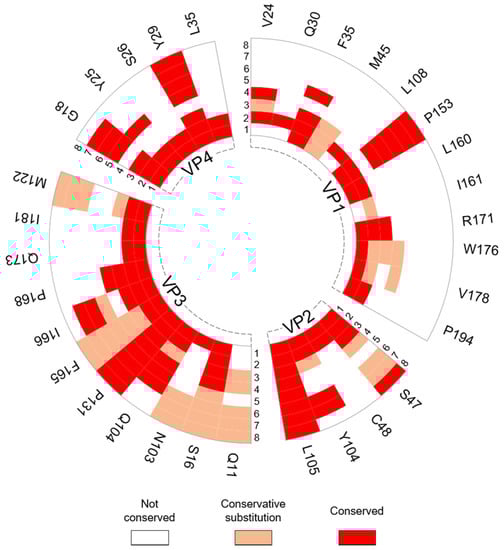 - Maree, F.F.; Blignaut, B.; de Beer, T.A.P.; Rieder, E. Analysis of SAT Type Foot-And-Mouth Disease Virus Capsid Proteins and the Identification of Putative Amino Acid Residues Affecting Virus Stability. PLoS ONE 2013, 8, e61612. [Google Scholar] [CrossRef]