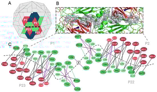 The interpentamer interfaces are located between the two-fold and three-fold axes of the capsid and involve VP2 subunits of two opposing protomers and VP3 proteins from the adjacent protomers of each pentamer. Thus, the pentamer interfaces are formed by four protomers that can be divided at the two-fold axes into two identical but inverse halves. Twenty-four hotspots were identified at the interpentamer interfaces by two or more prediction methods (Table S3), although it is important to reiterate that the 24 hotspots would be doubled along the full pentamer–pentamer interface, as shown in Figure 7.