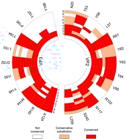 Eighteen hotspots were identified between the VP2–VP3 interface, with seven and eleven belonging to the two proteins, respectively. Six hotspots were identified between the two VP2 proteins, and no residues were predicted as hotspots between VP2 and VP4 (Figure 7B,C).