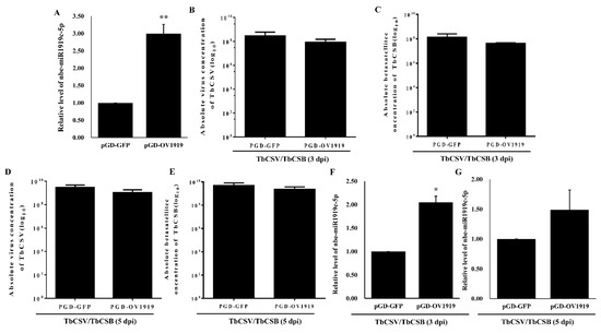 3.4. Over-Expression of Nbe-miR1919c-5p Reduced TbCSV and TbCSB DNA Accumulation in N. benthamiana Plants