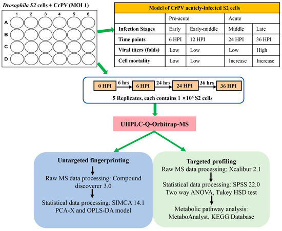 As illustrated in Figure 1, for infected S2 cell cultures, samples (N = 5) were collected at four time points during which infection rapidly becomes pathogenic (6–36 h post infection; 6 HPI, 12 HPI, 24 HPI and 36 HPI, respectively) [10]. Cellular extracts before CrPV infection (0 HPI) were also prepared as control samples. At each sampling time point, one well of the 12-well plate was used for quantification of cell numbers. Consequently, the same number of cells (106) was used for metabolite extraction at each time point.