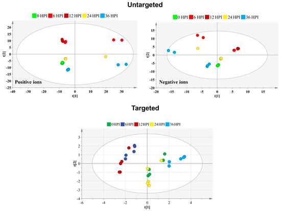 Score plot generated from the PCA-X model of untargeted and targeted metabolites. For the untargeted approach, the principal components analysis (PCA) score plot is presented separately for the positive and negative ion mode. The t [1] and t [2] values of each data point are the average scores of all samples in the principal components 1 and 2 of the model, respectively. Below is displayed the PCA score plot based on the 59 targeted metabolites identified at different time points after CrPV infection in S2 cells. Samples of different time points are shown in different colors that reveal satisfactory separation among particular samples. Incomplete separation is observed between 6 HPI and 12 HPI time points and between 0 HPI and 24 HPI samples.