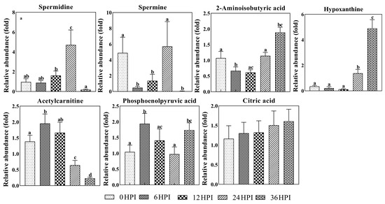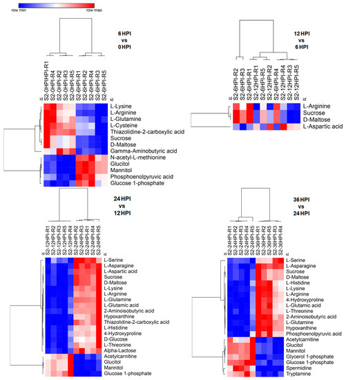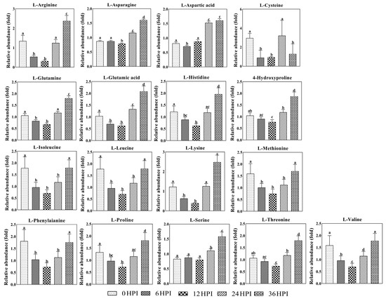 Next, analysis was performed on the abundance of 17 key amino acids (Figure 6). As was the case for most carbohydrates, amino acids typically declined during early stages (6 HPI and 12 HPI) and increased during later stages (24 HPI and 36 HPI). For a few amino acids (aspartic acid, asparagine and serine), only the increase during the late stages was observed (Figure 6).