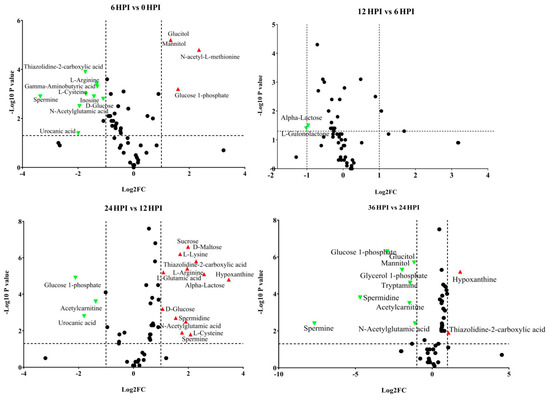 Volcano plots of all identified metabolites in S2 cells at different time points of CrPV infection: comparison between consecutive stages of infection. In the volcano plot, the log scaled value of the fold change (FC, x-axis) is plotted against the –log 10 p-value from multiple t-test analysis (y-axis). The dashed lines delineate metabolites with fold change > 2 and p-value < 0.05. Compound identities are displayed for both upregulated (right side; red upward triangle) or downregulated (left side; green downward triangle) metabolites.